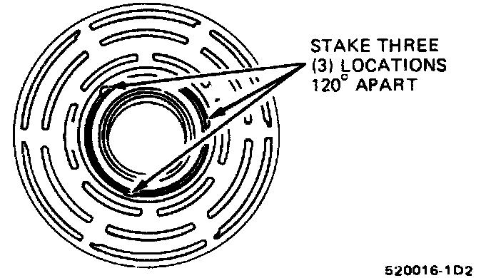 The stake metal should not contact the outer race of the bearing to prevent the possibility of distorting the outer race. Stake three (3) places 120° apart as shown in illustration.