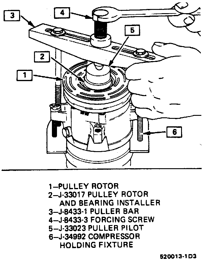 8. Tighten the center screw in the J-8433-1 puller crossbar to force the pulley rotor and bearing assembly onto the compressor front head. Should the J-33017 pulley rotor and bearing installer slip off direct in-line contact with the inner race of the bearing, loosen the J-8433-1 center forcing screw and realign the installer and pilot so that the J-3301 7 installer will properly clear the front head.
