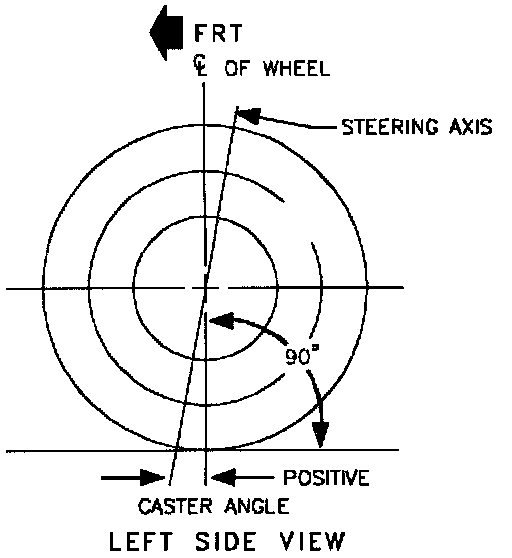 Caster is a measure of the angle between the steering axis and vertical when viewed from the side of the vehicle with the wheel in the straight ahead position. The steering axis is determined by the location of the lower control arm ball joint and the center of the strut-to-body attachment. A line drawn through the center of the ball joint and the strut-to-body joint represents the steering axis. When the center point of the strut-to-body attachment is rearward of the ball joint, the caster is positive. When the center of the strut-to-body attachment is forward of the ball joint, the caster is negative.