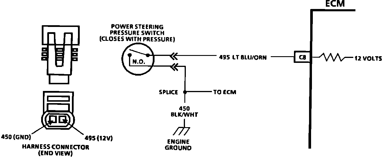 The power steering pressure switch is normally open to ground, and CKT 495 will be near battery voltage.