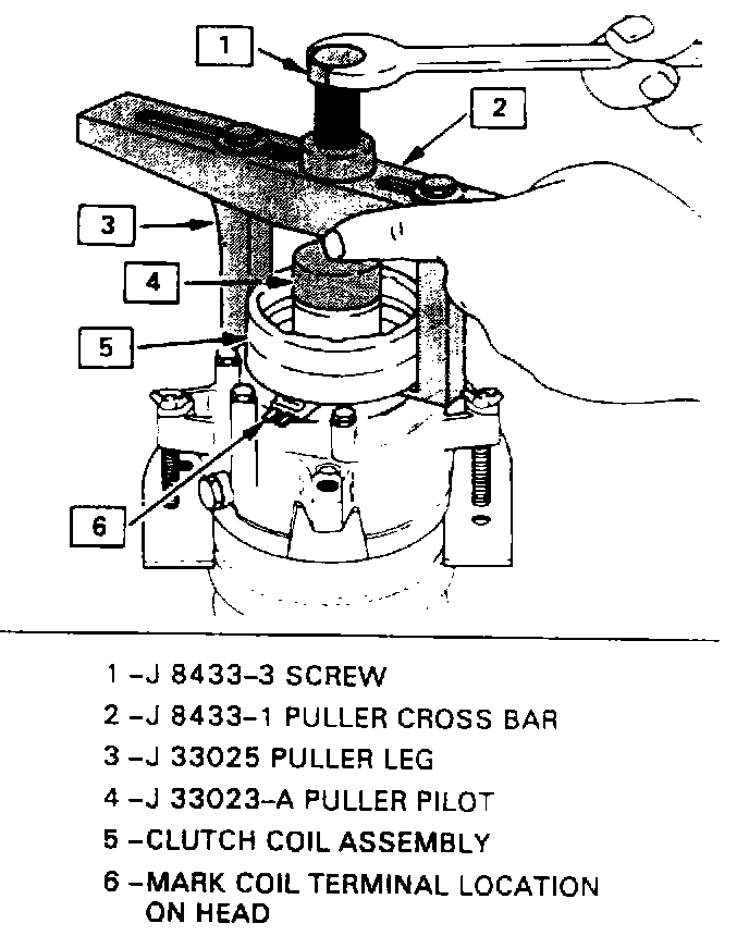 3. Tighten J 8433-3 forcing screw against the puller pilot to remove the clutch coil.