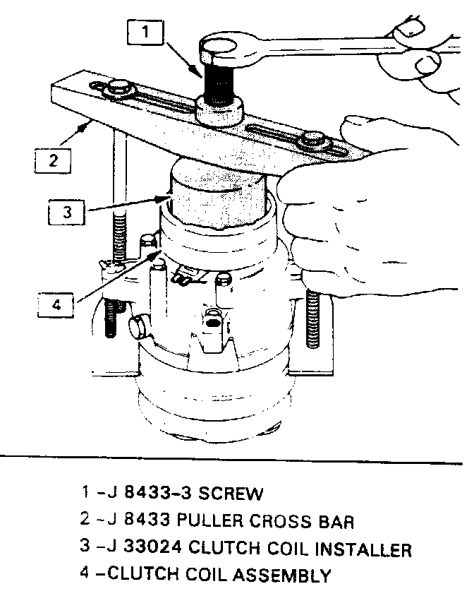 4. Turn the center forcing screw of the J 8433-1 puller crossbar to force the clutch coil onto the front head. Be sure clutch coil and J 33024 installer stay "in-line" during installation.