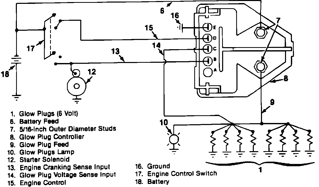 The assembly contains the circuitry which monitors and controls glow plug relay operation. Information received at pins B and C is used by the controller to determine glow plug operating requirements. Pin B senses voltage at the starting motor solenoid. Pin C senses glow plug voltage. the controller also senses ambient temperature.