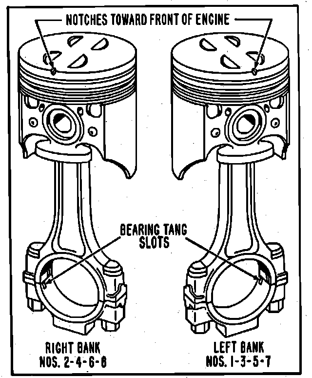 Connecting rod bearing inserts are available in standard size and undersizes of .001 inch, .002 inch, .010 inch and .020 inch. The bearings can be replaced without removing the rod assembly by removing the cap and replacing the upper and lower halves of the bearing.