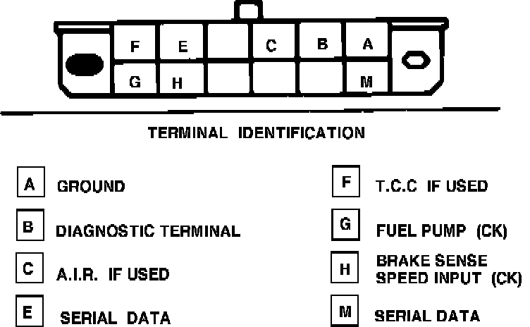 The means of communicating with the control module is the Data Link Connector (DLC) located under the instrument panel and is sometimes covered by a plastic cover labeled "DIAGNOSTIC CONNECTOR". The DLC is used in the assembly plant to receive engine information to determine proper operation before it leaves the plant. The Diagnostic Trouble Codes (DTC's) stored in the control module memory can be displayed by counting the number of flashes of the Malfunction Indicator Lamp (MIL) "Service Engine Soon" when the diagnostic terminal of the DLC is grounded. The DLC terminal "B" (diagnostic terminal) is the second terminal from the right of the DLC top row. The terminal is most easily grounded by connecting it to terminal "A" (internal control module ground), which is located to the right of terminal "B" on the top row of the DLC.