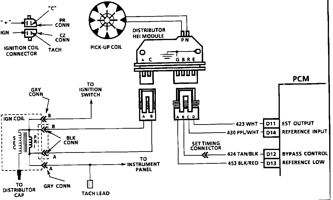The ignition system has a distributor module with four terminals for the EST system that are connected by the ECM/PCM.