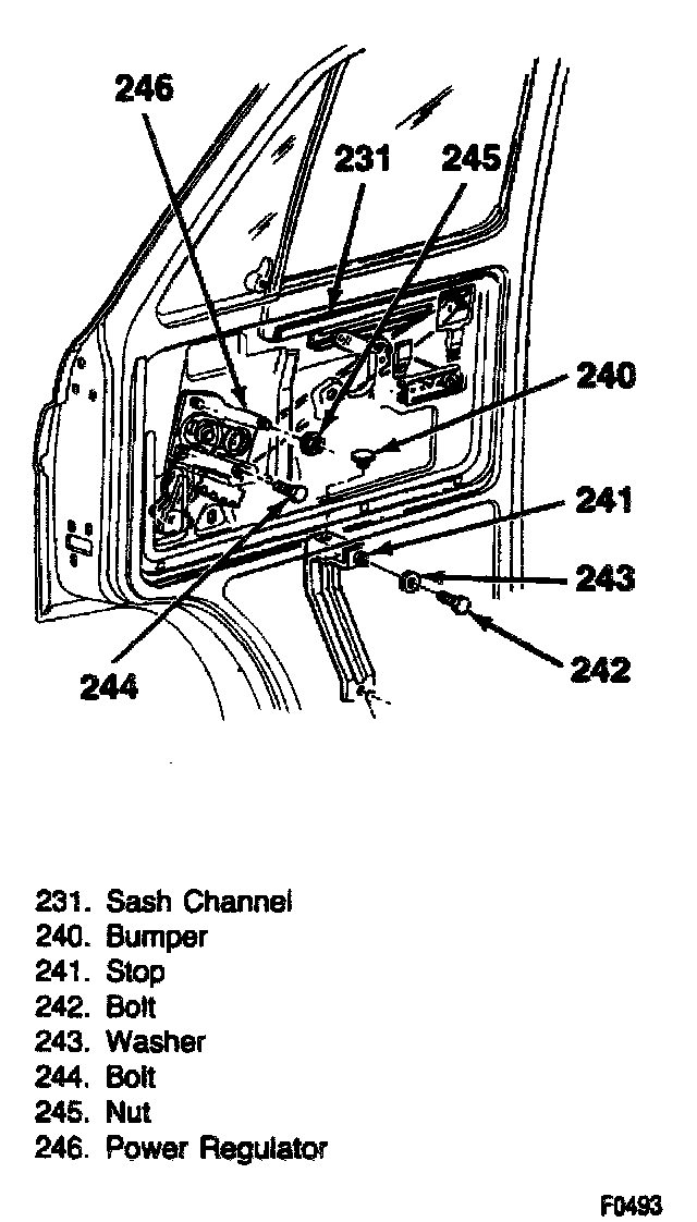 A. Slide the regulator rearward to disengage the rear roller from the sash channel. Also disengage the lower roller from the regulator rail.