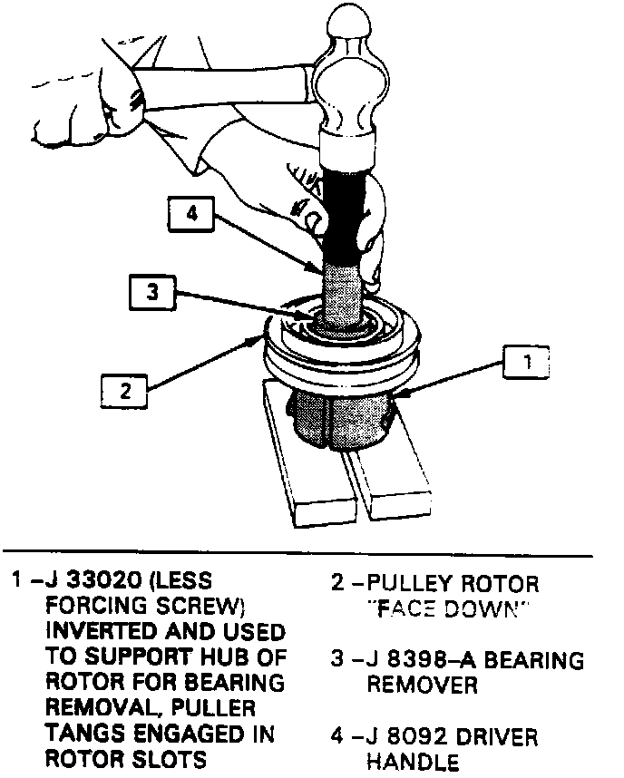 5. To prevent damage to the pulley rotor during bearing removal the rotor hub must be properly supported.