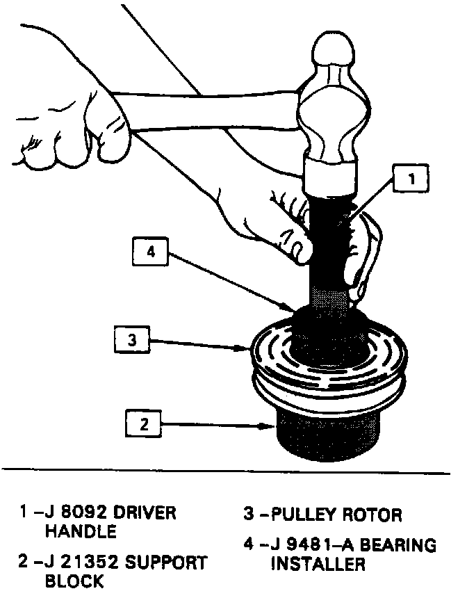 1. Place the pulley rotor on the J 21352-A support block to fully support the rotor hub during bearing installation.