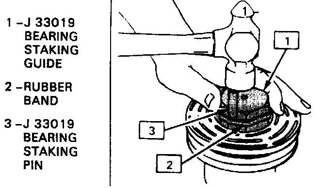 13. Shift the rotor and bearing assembly on the J 21352-A support block to give full support of the hub under the staking pin location. A heavy-duty rubber band may be used to hold the stake pin in the guide, and the stake pin should be properly positioned in the guide after each impact on the pin.