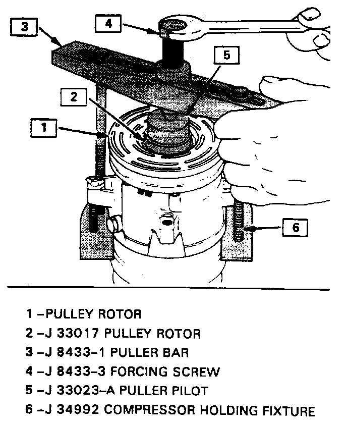 8. Tighten the center screw in the J 8433-1 puller crossbar to force the pulley rotor and bearing assembly onto the compressor front head. Should the J 33017 pulley rotor and bearing installer slip off direct in-line contact with the inner face of the bearing, loosen the J 8433-3 center forcing screw and realign the installer and pilot so that the J 33017 installer will properly clear the front head.