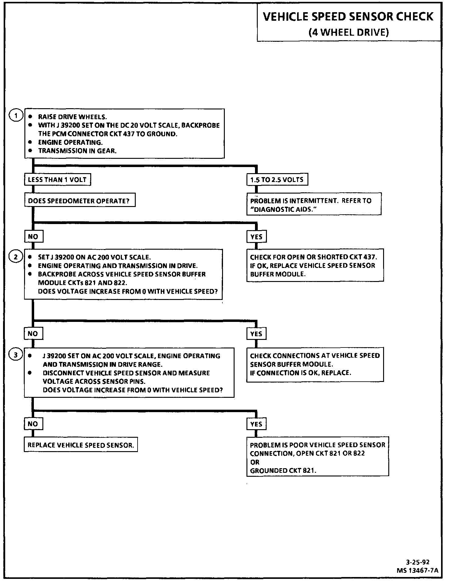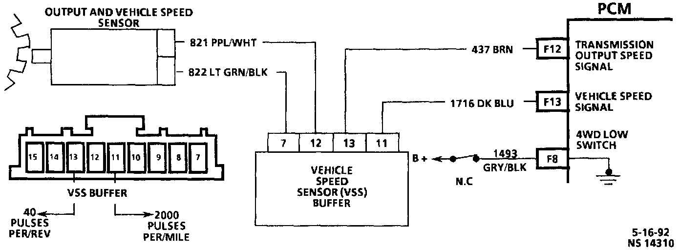 The [1][2]speed sensor circuit consists of a magnetic induction type sensor, a vehicle speed sensor buffer module, 4WD Low switch and wiring. Gear teeth pressed onto the output shaft induce an alternating current in the sensor. This signal is transmitted to the buffer. The buffer compensates for various axle ratios and converts the signal into a square wave for use by the speedometer, cruise control, antilock brakes and PCM. The buffer sends two different signals to the PCM. The 1716 circuit relays the vehicle speed which is used to control engine operating functions and DTC 16. The 437 circuit relays the transfer case output speed to the PCM. PROM uses both the transfer case output speed signal and the 4WD Lo switch to determine the transmission output shaft speed. The PCM uses transmission output shaft speed for shift points, line pressure control, TCC control, DTC 24 and DTC 72.