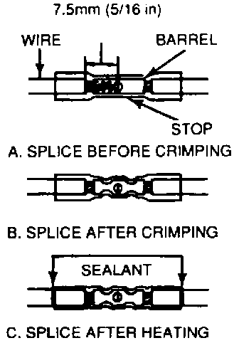 Insert the wire into the splice sleeve until it hits the barrel stop and close the handles of the crimp tool tightly until the crimper handles open when released. The crimper handles will not open until the proper amount of pressure has been applied to the splice sleeve. Repeat steps 4 and 5 for the opposite end of the splice. Figure shows the condition of the splice sleeve after crimping.