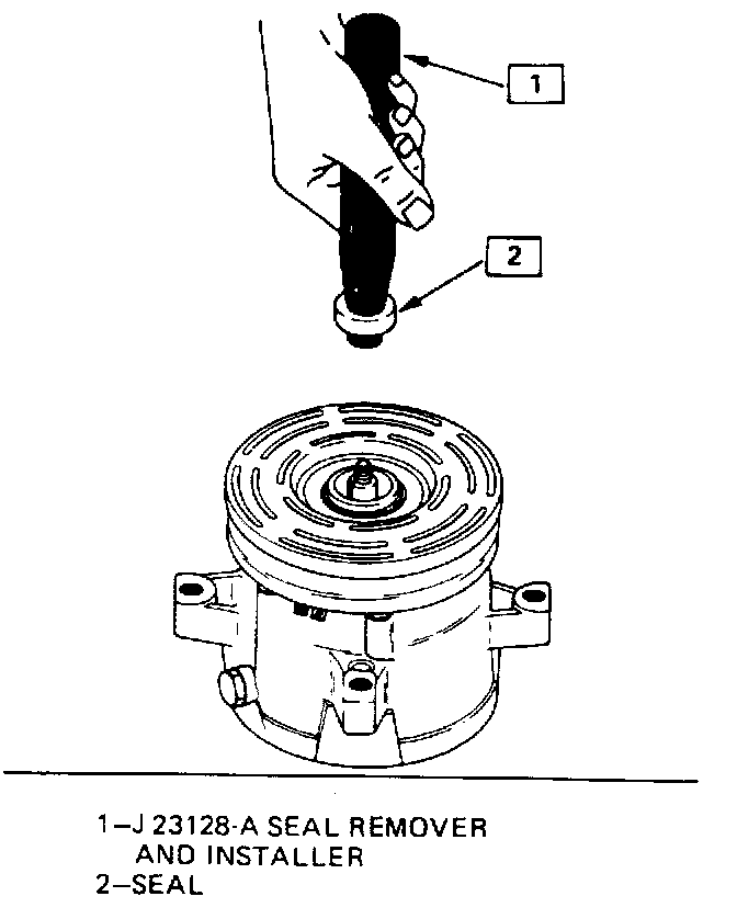6. Fully engage the knurled tangs of seal remover-installer J 23128-A into the recessed portion of the seal by turning the handle clockwise. Remove the seal from the compressor with a rotary-pulling motion. Discard the seal. The handle should be hand-tightened securely. Do not use a wrench or pliers.