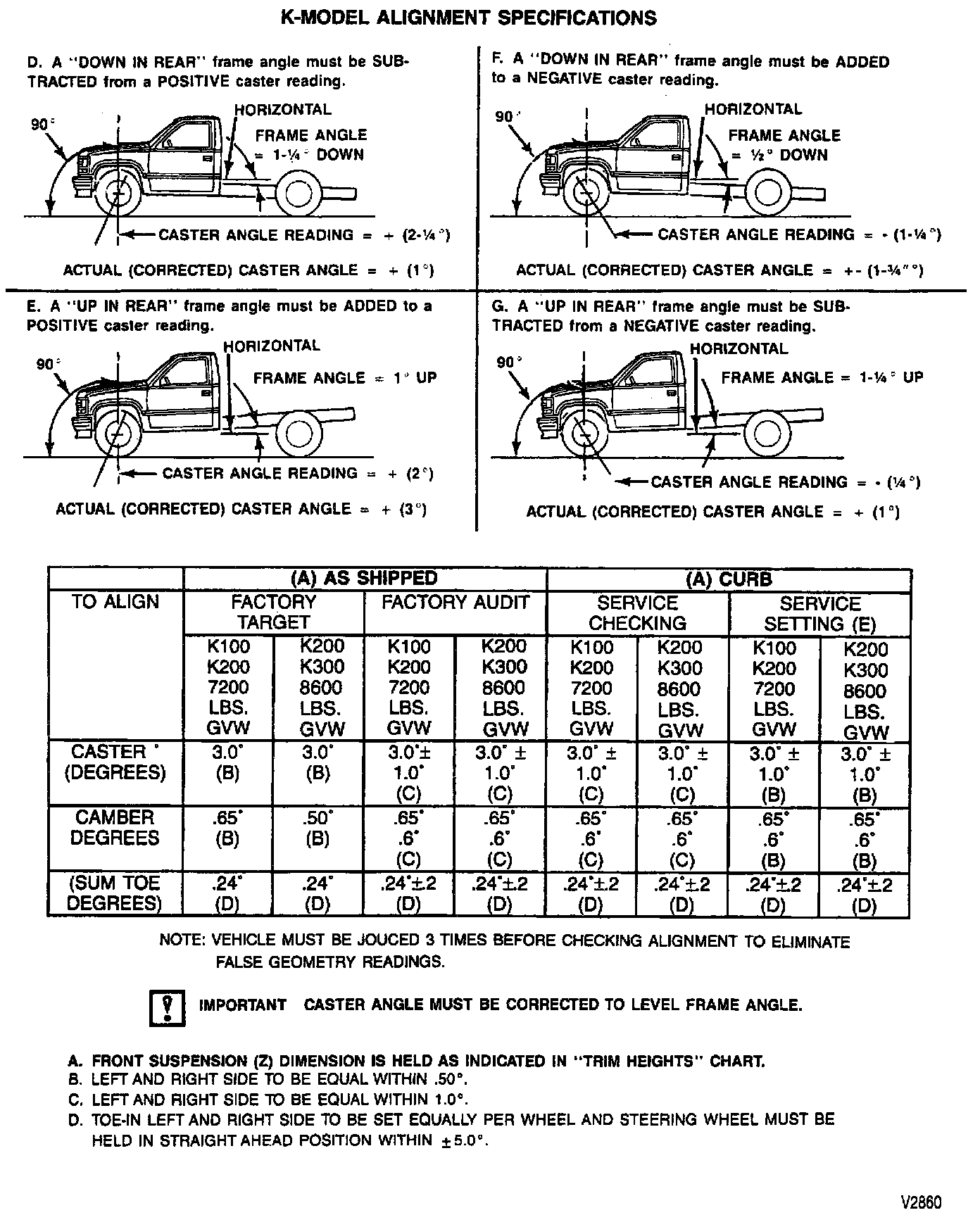 ^ Check "Front Wheel Alignment Specifications" in the illustration for special requirements and alignment adjustments. Check trim height "Z" and "D." Verify alignment specifications before proceeding.