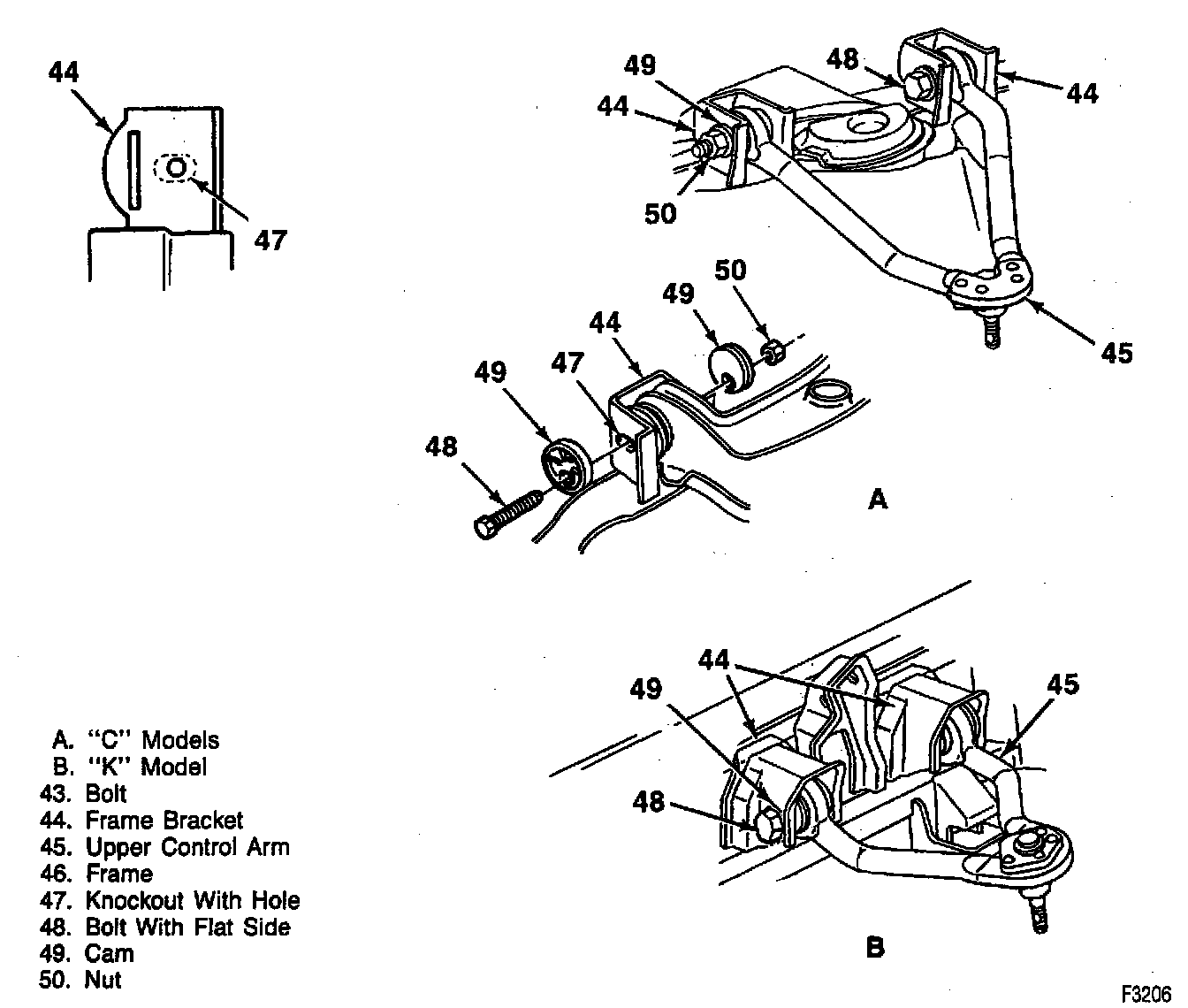 2. Bolts (48) and cams (49) through frame brackets (44), and control arm (45)