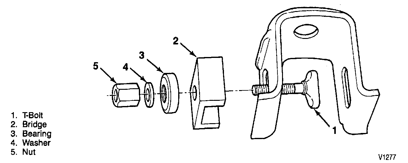 ^ Install bridge onto the T-bolt. The forward bracket requires the bridge to be installed between the legs of the bracket due to access problems.