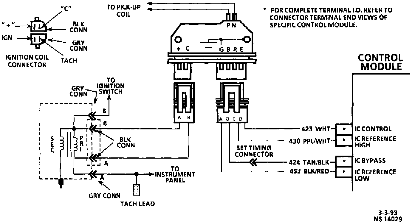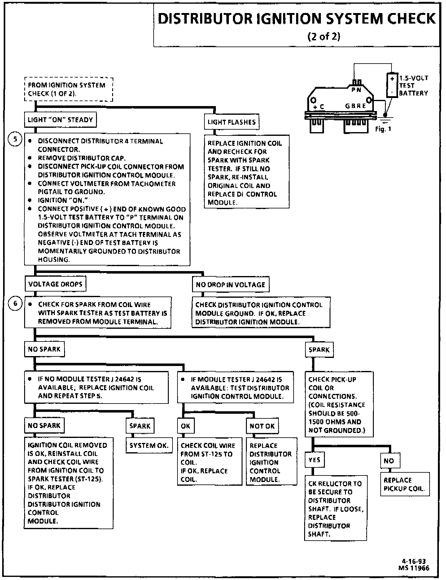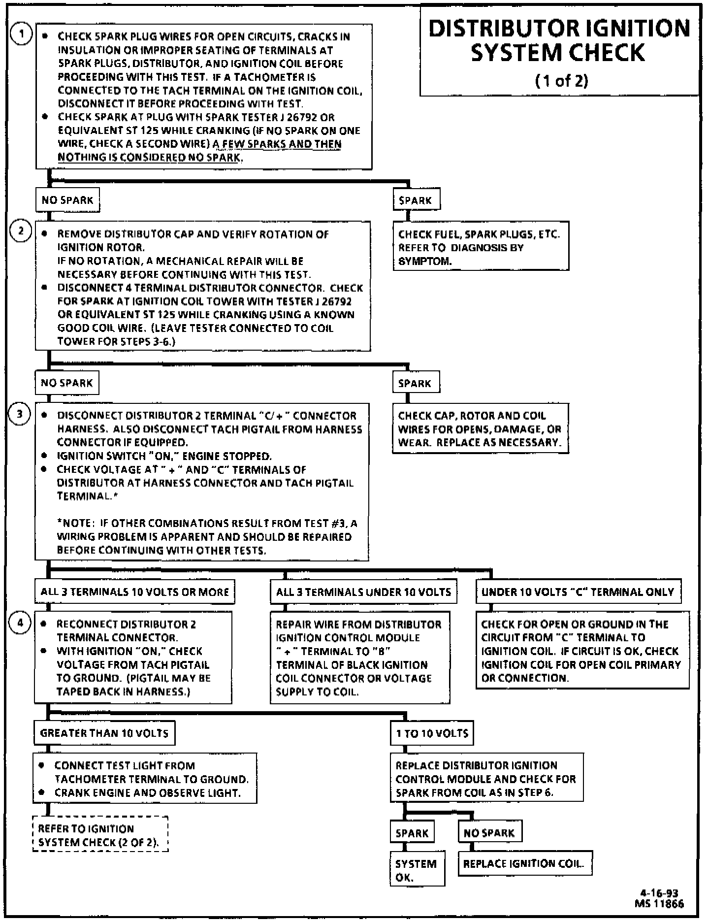 Diagnostic Aids: A Tach filler could cause an ignition system problem. If voltage measured at distributor 2 terminal connector (Terminal "C") with ignition "ON" increases when tach terminal connector is disconnected the filter is faulty and should be replaced.