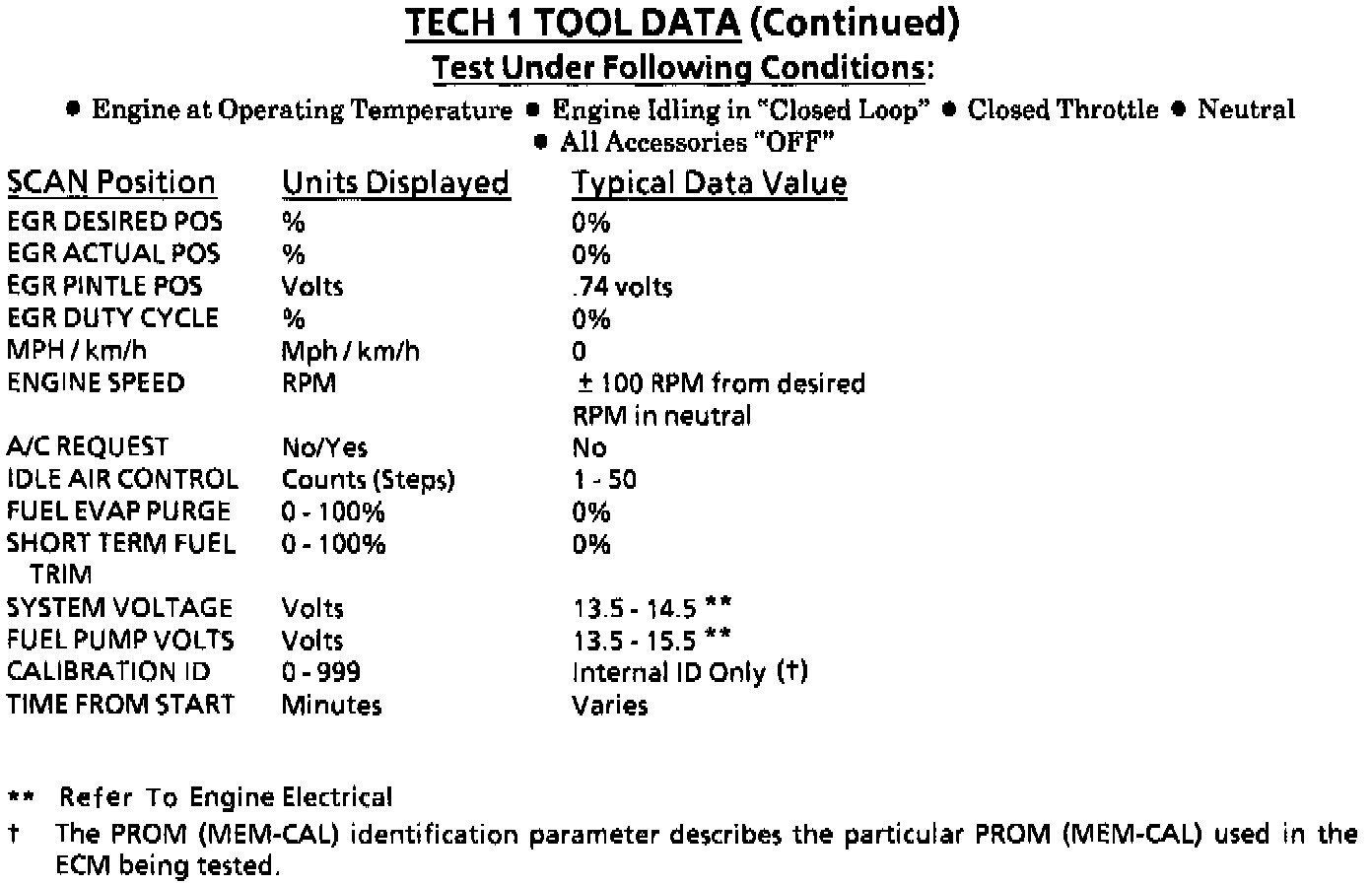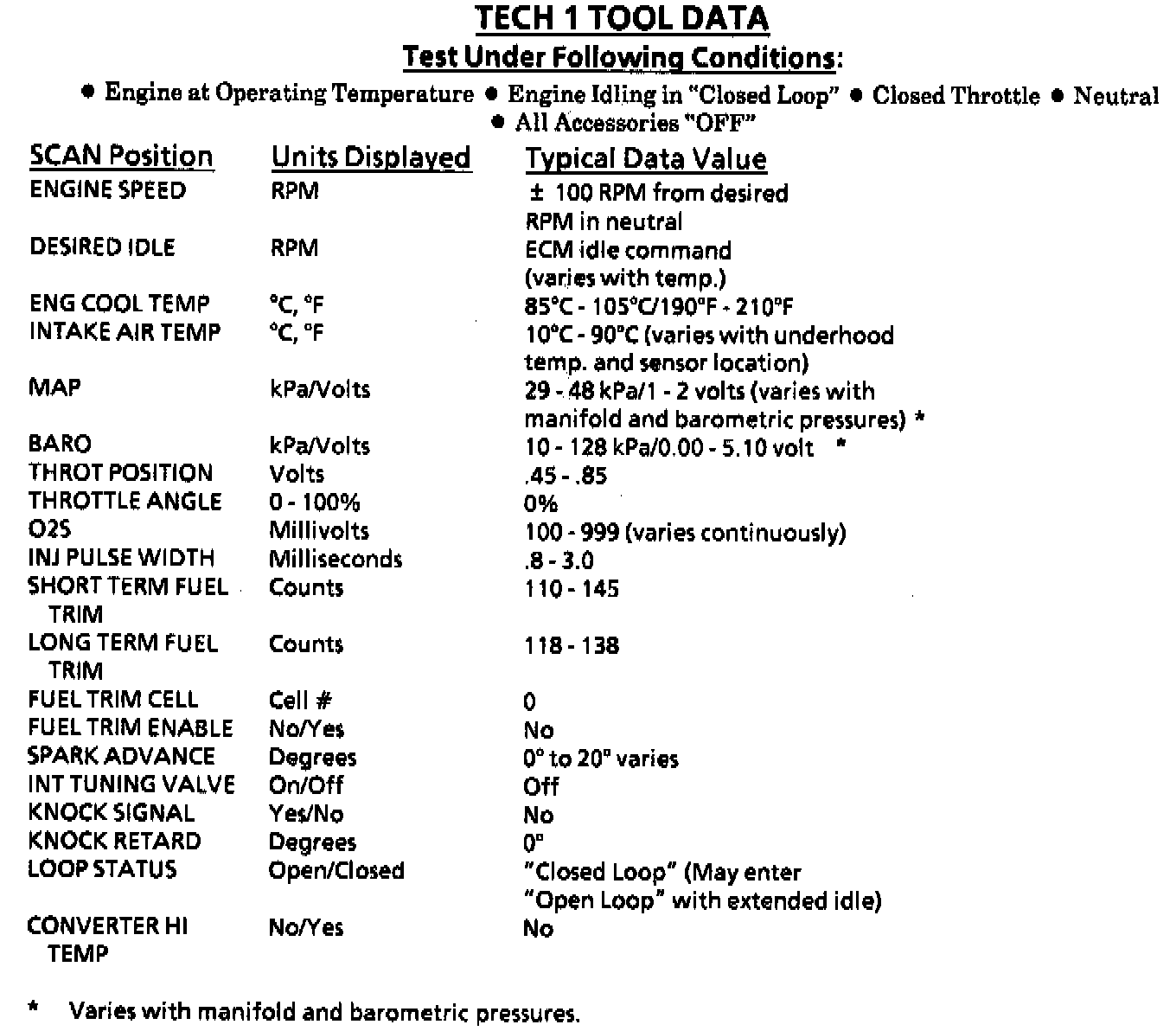 TYPICAL TECH 1 SCAN DATA VALUESThe Tech 1 scan data listed in this table may be used for comparison after completing the On-Board Diagnostic System Check and finding the on-board diagnostics functioning properly with no Diagnostic Trouble Codes (DTC) displayed. The "Typical Tech 1 Data Values" are an average of display values recorded from normally operating vehicles and are intended to represent what a normally functioning system would display. The values you get may vary due to low battery charge or other reasons, but they should be very close.