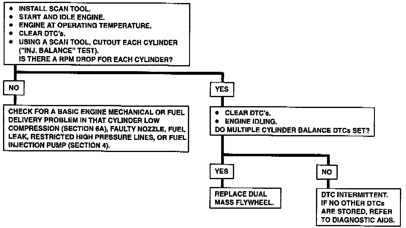 To properly identify suspect cylinders, a scan tool must be used. The scan tool "INJ. BALANCE" test will cutout the specific cylinder requested. The scan tool will cutout a specific cylinder for 60 second intervals (you can repeat cylinder cutout for the same cylinder as needed). Faulty injection nozzles will set cylinder balance DTCs and should always be checked first. A nozzle can be swapped from one cylinder to another as a quick check to identify a fault.