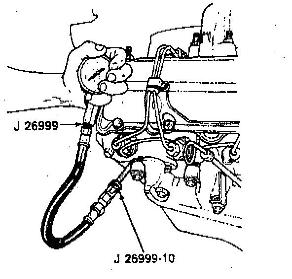 5. Screw the J 26999-10 into the glow plug hole of the cylinder that is being checked. Connect the J 26999-10 to the J 26999.
