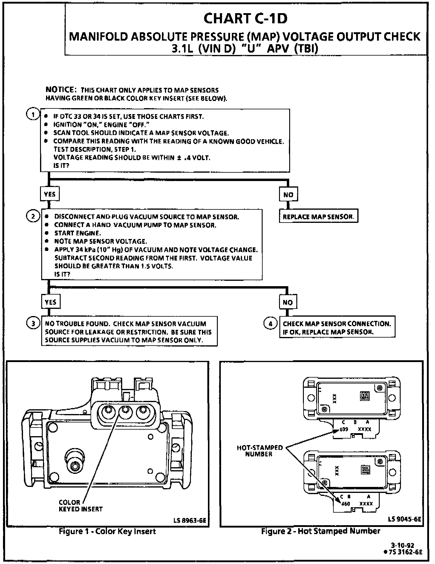 1. When comparing Tech 1 scan tool readings to a known good vehicle, it is important to compare vehicles that use a MAP sensor having the same color insert or having the same "Hot Stamped" number. See figures on diagnostic chart.