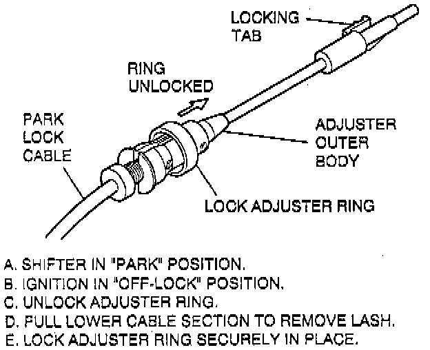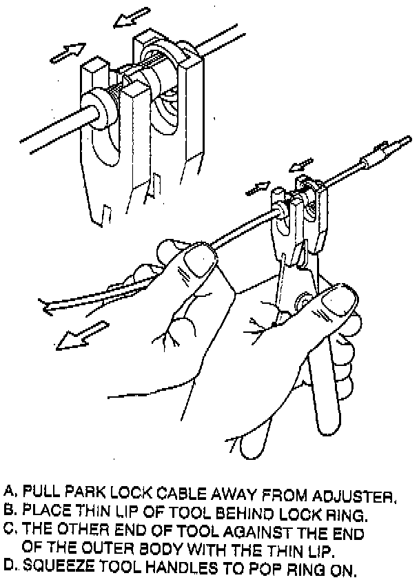 d. Pull on cable until park lock latch contacts gear shift lever.