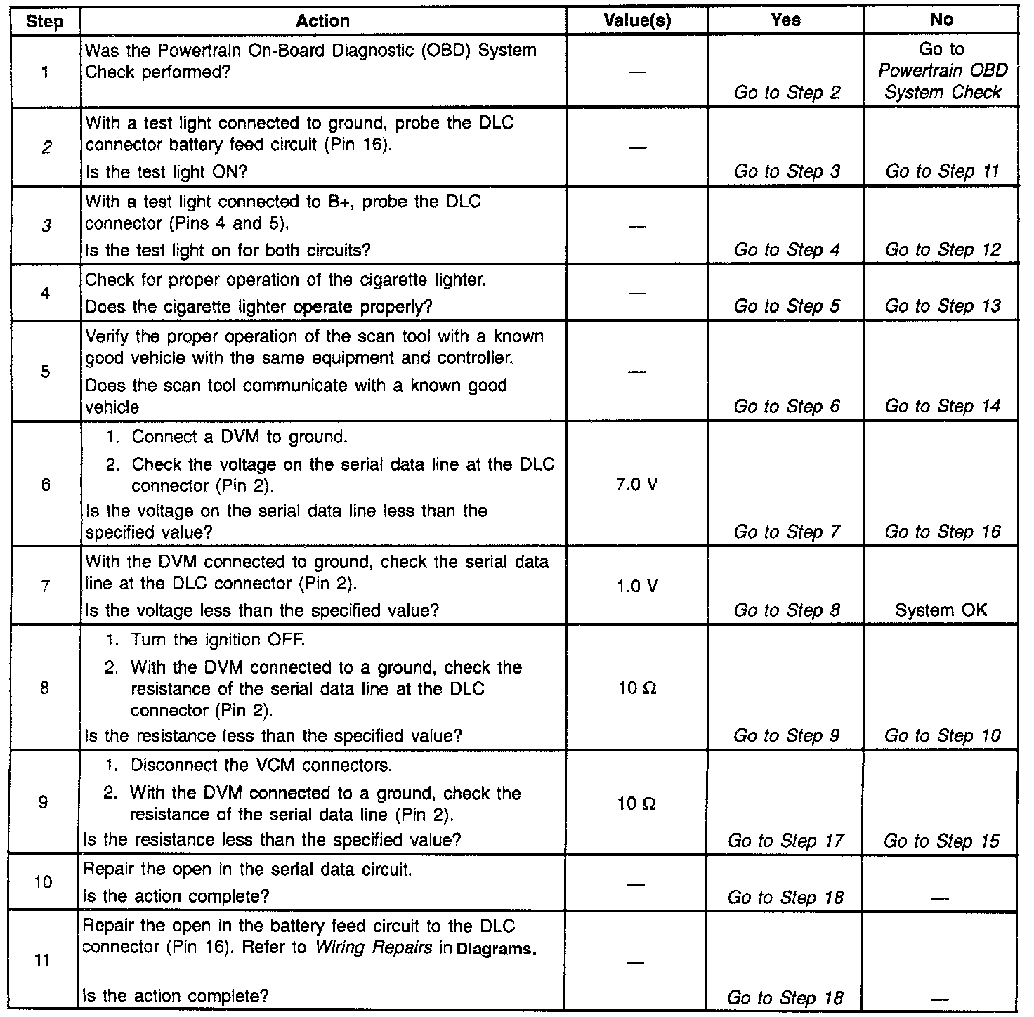 The numbers below refer to the step numbers on the diagnostic table.