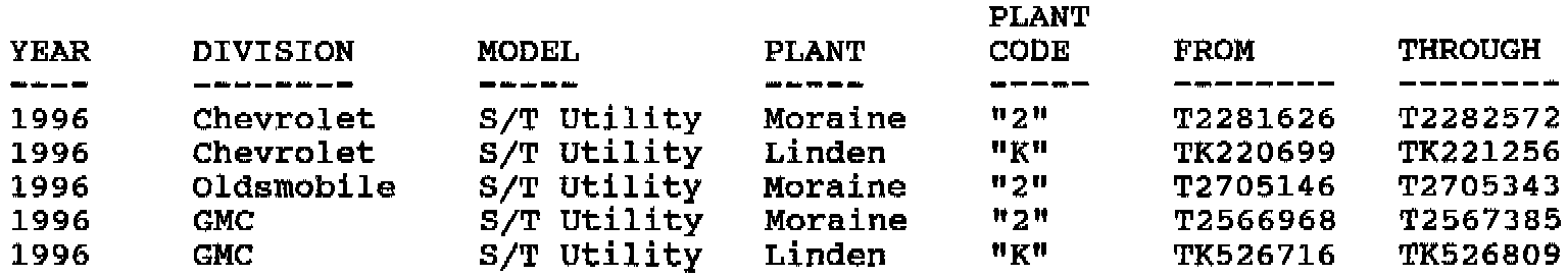 Involved are certain 1996 S/T 4-door Utility model vehicles built within the VIN breakpoints as shown.