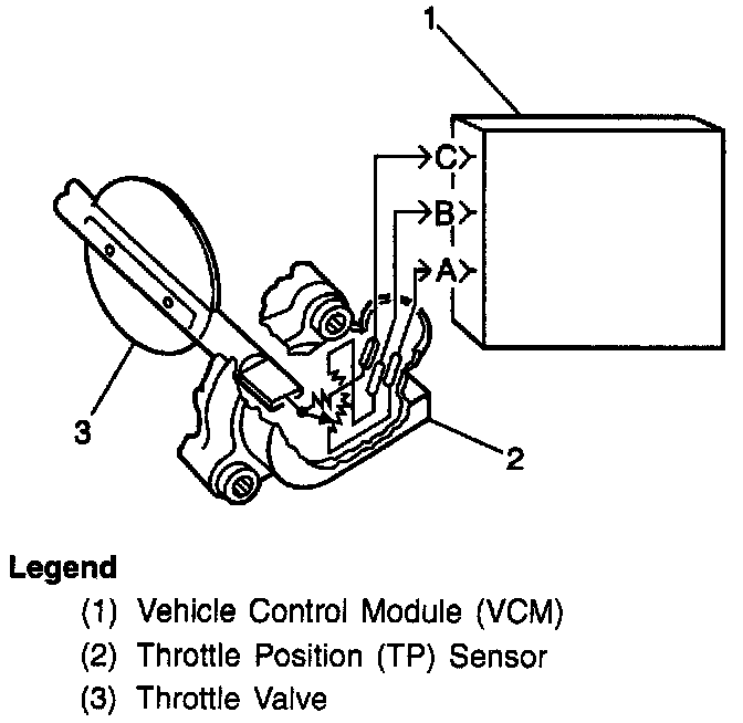 The Throttle Position (TP) sensor is a potentiometer. The TP sensor is connected to the throttle shaft on the throttle body. By monitoring the voltage on the signal line, the VCM calculates throttle position. As the throttle valve angle is changed (accelerator pedal moved), the TP sensor signal also changes. At a closed throttle position, the output of the TP sensor is low. As the throttle valve opens, the output increases so that at Wide Open Throttle (WOT,) the output voltage should be above 4.0 volts.