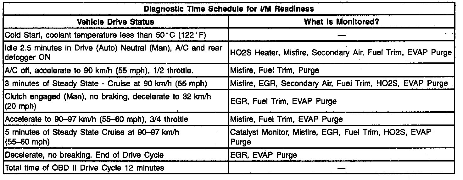 NOTE: The System Status display indicates only whether or not the test has been completed and does not necessarily mean that the test has passed. If a "Failed Last Test" indication is present for a DTC associated with one of the above systems, that test is failed; diagnosis and repair is necessary to meet the I/M 240 requirement. Verify that the vehicle passes the all of the diagnostic tests associated with the displayed System Status prior to returning the vehicle to the customer. Refer to the Typical OBD II Drive Cycle image (more than one drive cycle may be needed) to use as a guide to complete the I/M 240 System Status tests.