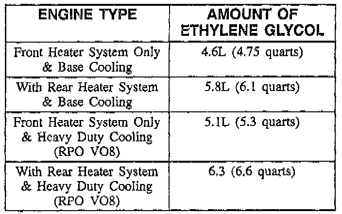 ^ If the coolant system has been flushed, first add 100 percent ethylene glycol in the amount listed in the illustration for the appropriate engine cooling and heating option. Then slowly add clean water to the system until the level of the coolant mixture has reached the port of the coolant temperature switch. Wait for two minutes and recheck the level of the coolant mixture, add clean water if necessary to restore the coolant mixture level to the port of the coolant temperature switch. Install the coolant temperature switch. Then slowly add clean water to the system until the level of the coolant mixture has reached base of the radiator neck. Wait for two minutes and recheck the level of the coolant mixture, add clean water if necessary to restore the coolant mixture level to the base of the radiator neck.