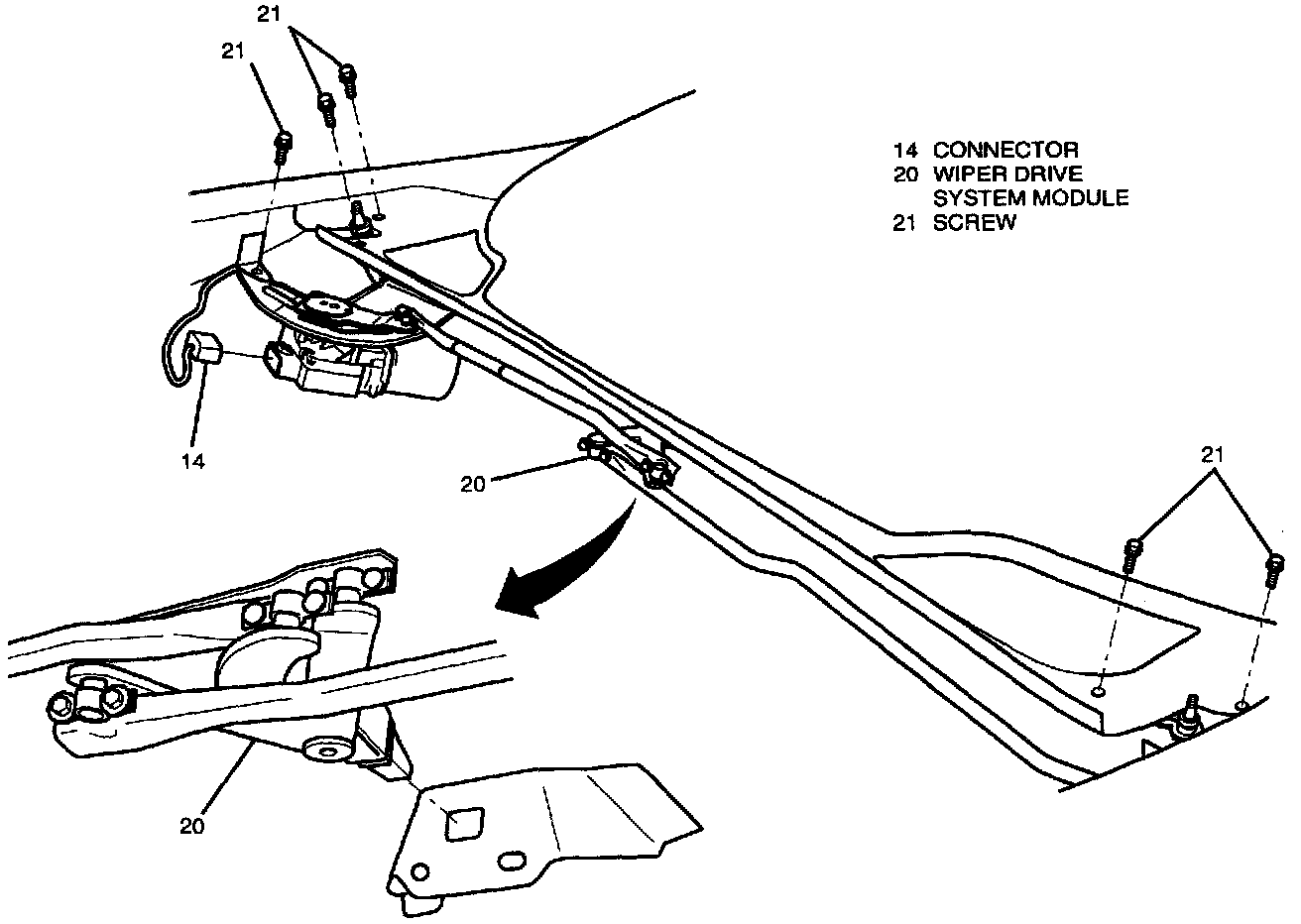 8. Three remaining screws (21) and wiper drive system module (20) from vehicle.