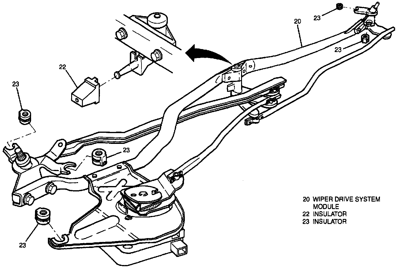 9. Six insulators (22 and 23) from wiper drive system module (20).