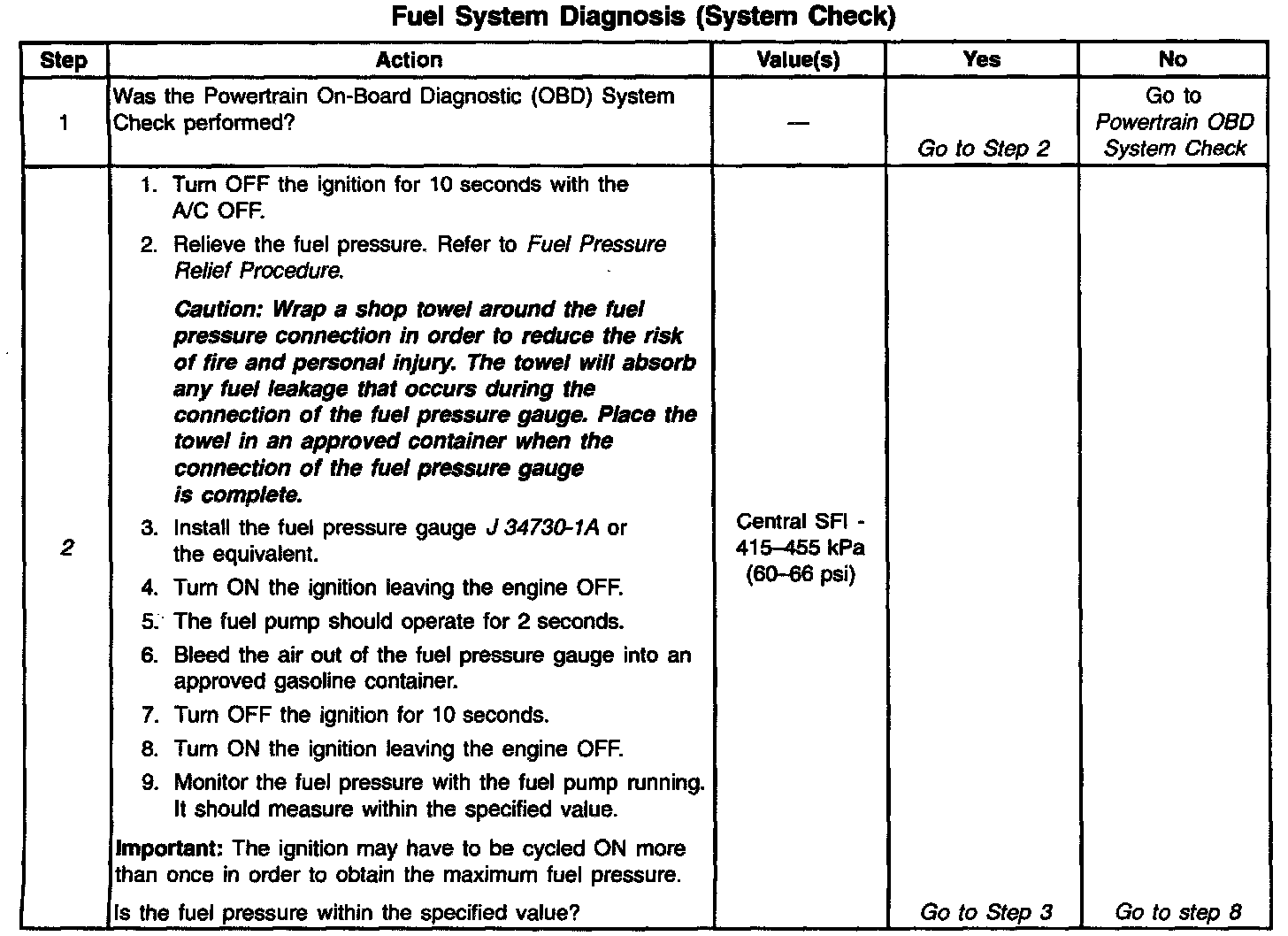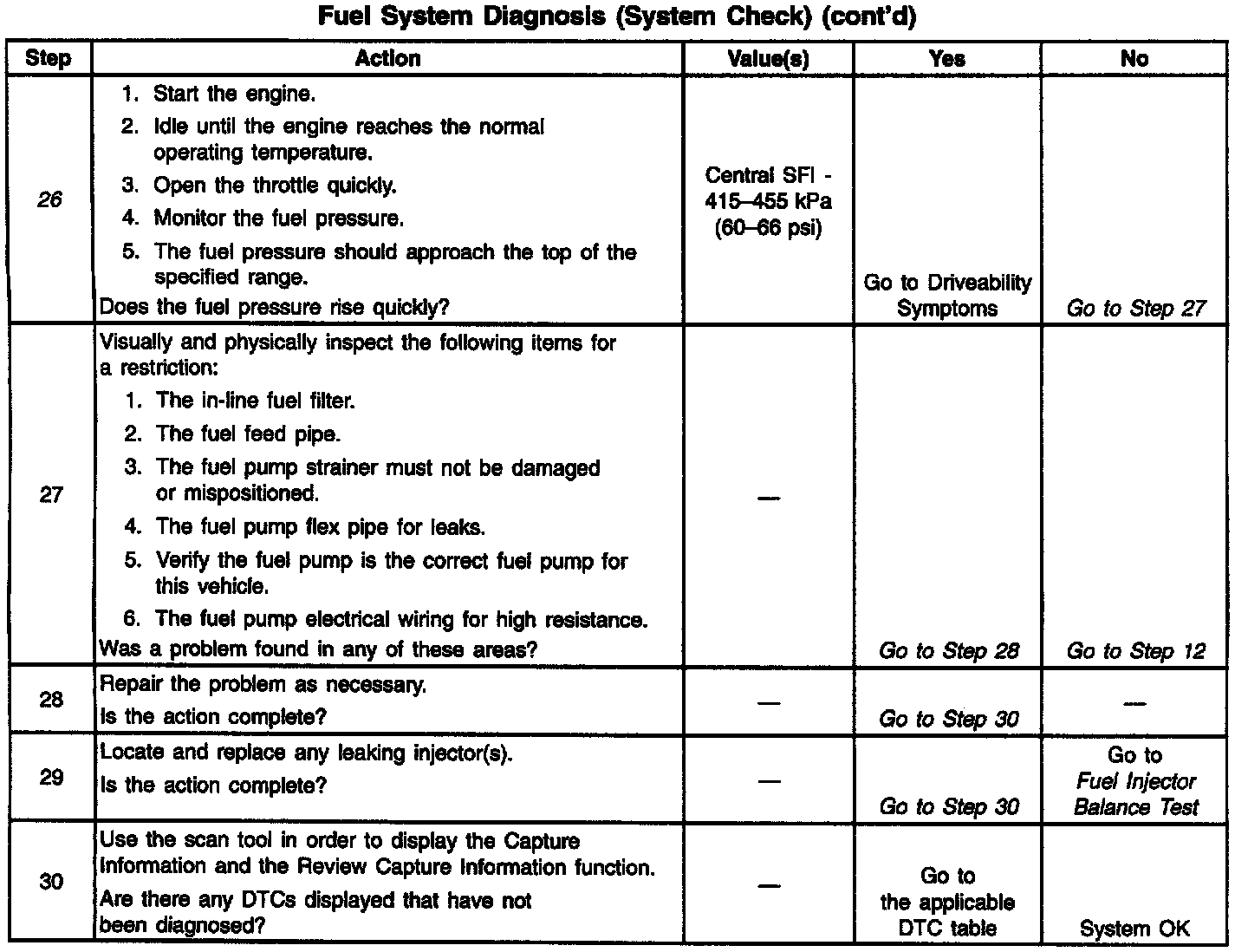 ^ The pressure is regulated but less than 415 kPa (60 psi).The amount of fuel reaching the injector is sufficient, but the pressure is too low. The system will run lean, hard starting cold, no start, overall poor performance, and may set a DTC. Refer to Engine Cranks but Does Not Run. Engine Cranks, But Will Not Run