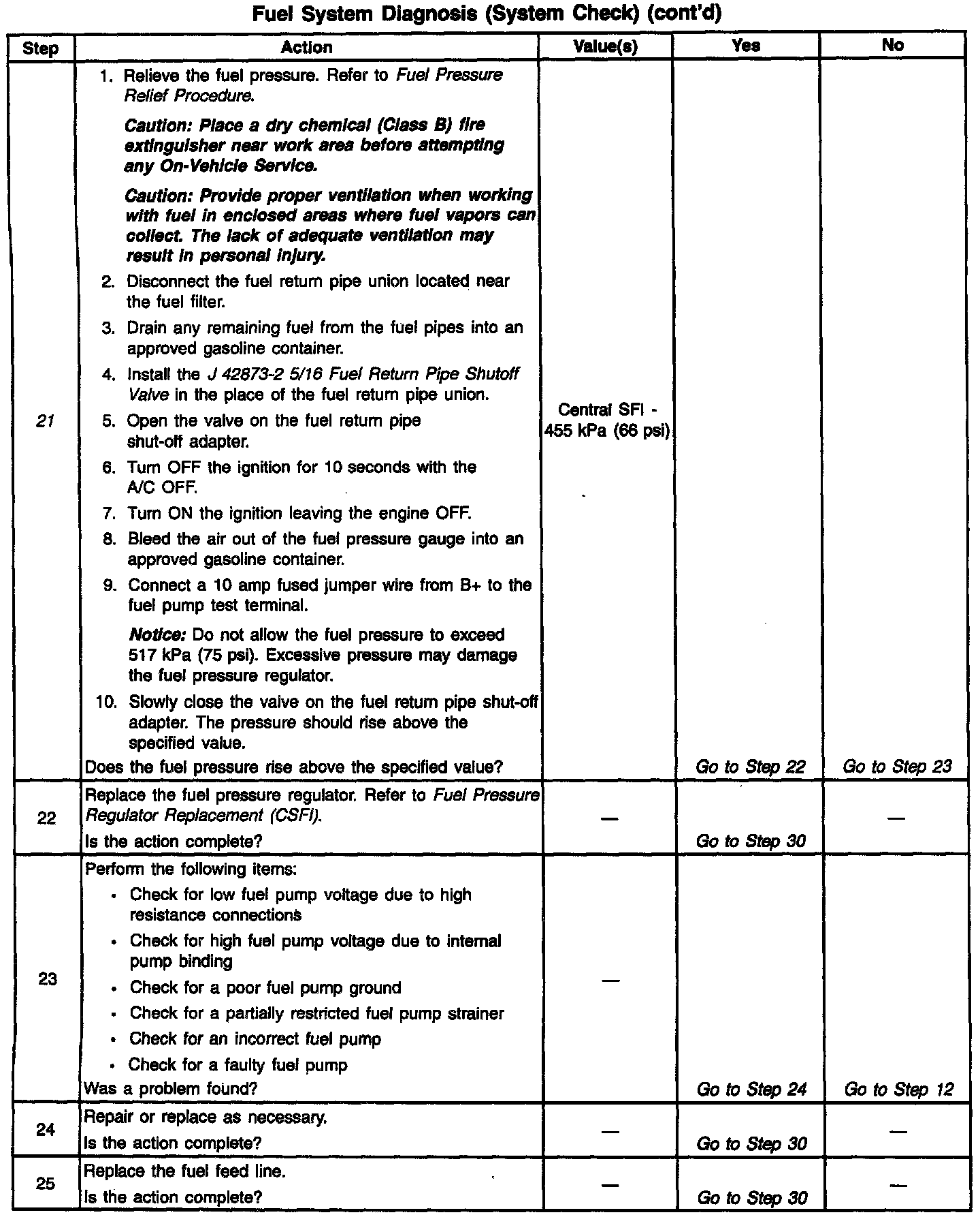 21. Restricting the fuel return line allows the fuel pressure to build above regulated pressure. With the battery voltage applied to the fuel pump test terminal, the pressure should rise above 455 kPa (66 psi), as the valve in the return line is partially closed.