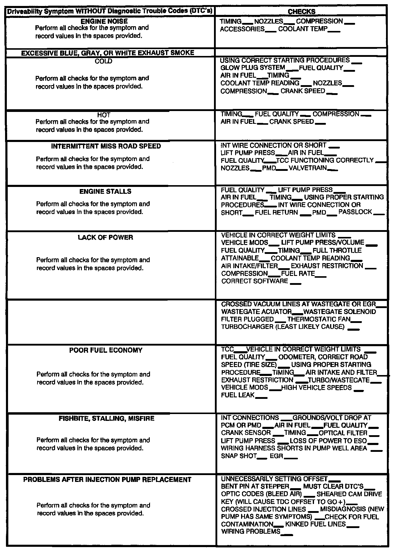 1. Prior to removal and request of an injection pump, perform diagnostics, based on symptom. Follow the latest version of the Diesel Diagnostic Section in the Service Manual and utilize the Diesel EFI Diagnostic Worksheet (Attachment 1).