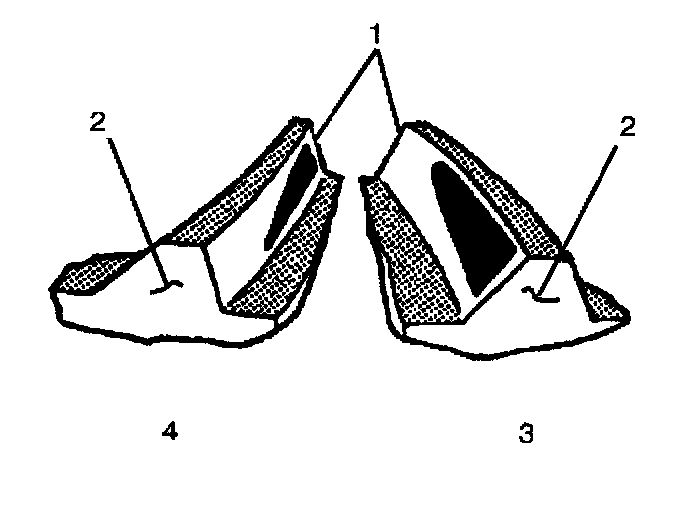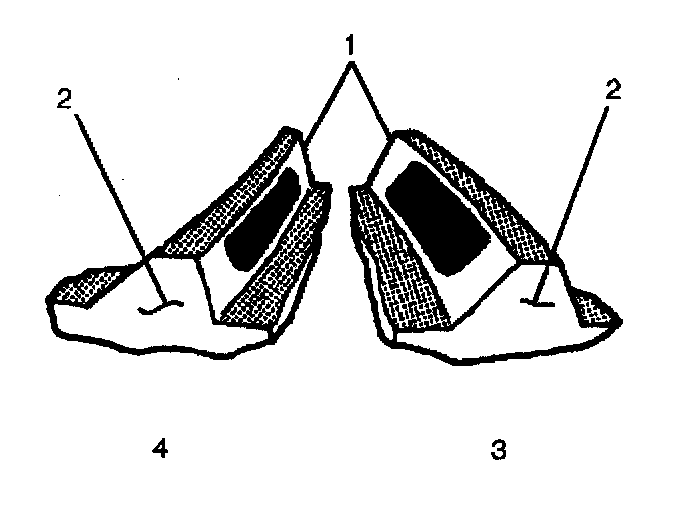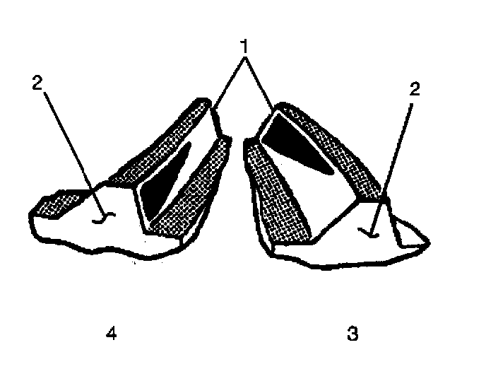 The side of the ring gear tooth which curves outward, or is convex, is the drive side (4). The concave side is the coast side (3). The end of the tooth nearest the center of the ring gear is the toe end (2). The end of the tooth farthest away from the center is the heel end (1).