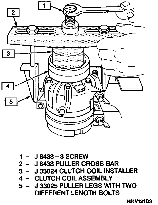 4. Turn the center forcing screw of the J 8433-1 puller crossbar to force the clutch coil onto the front head. Be sure clutch coil and J 33024 installer stay "in-line" during installation.