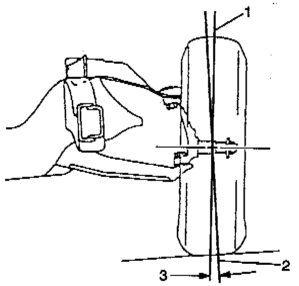 The camber is the inward or outward tilting of the front wheel from the vertical (1) when viewed from the front of the vehicle. When the wheels tilt outward at the top, the camber is positive (3). When the wheels tilt inward at the top, the camber is negative (2). The camber influences both the directional control and the tire wear and will also cause a vehicle to pull or lead to one side (whichever wheel has the most positive camber).