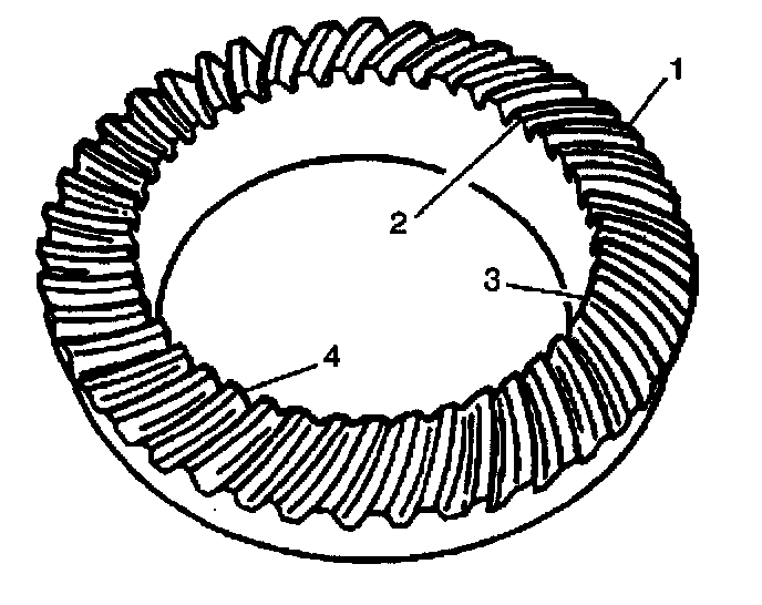 2. Place the indicator tip of the J39704 on the heel end (1) of the ring gear tooth.
