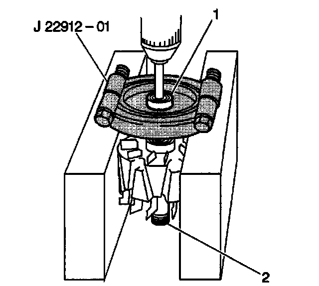 11. Remove the rear bearing (1) from the rotor (2) using a J22912-O1 and a press.
