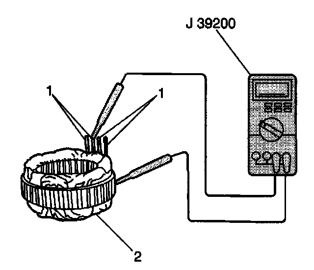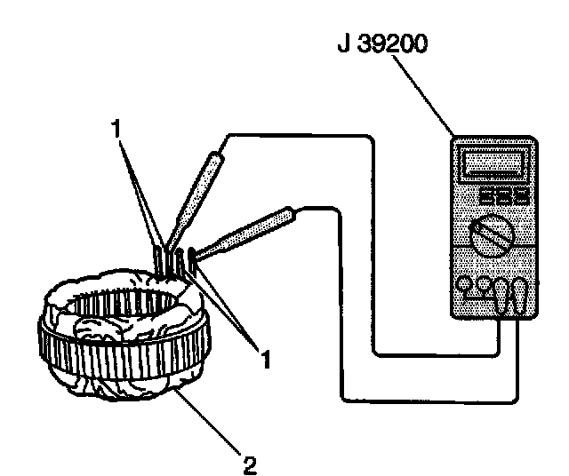 5. Measure the resistance between all stator leads (1) and the stator core using the J 39200. If the resistance is less than 5 ohms, replace the stator.