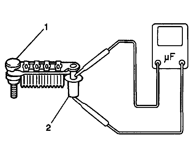 10. Measure the condenser (2) capacity using a digital capacitor meter. If the condenser capacity is not 0.5 microfarads, replace the rectifier.