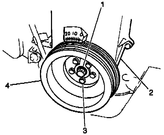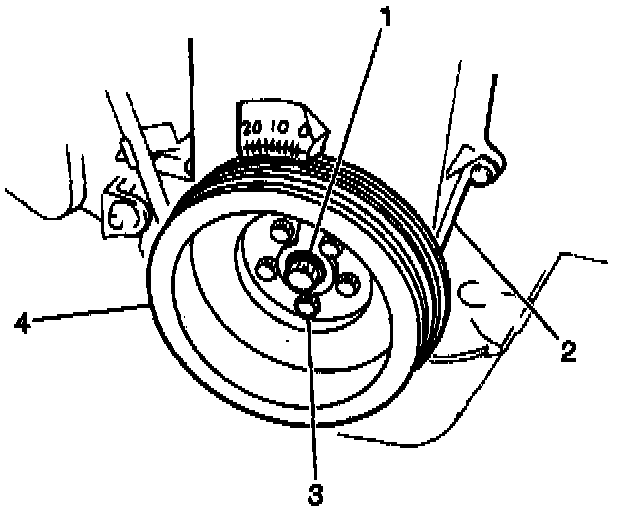 8. Install the crankshaft pulley (4) to the crankshaft. Secure the pulley with five bolts (3).