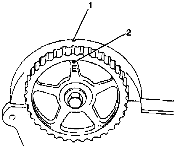 IMPORTANT: There are two sets of timing marks which must be aligned to ensure the correct engine timing belt installation. A notch in the camshaft timing belt gear designed as E must be aligned with the notch in the cylinder head cover. A punch mark on the crankshaft timing belt gear should then align with the arrow in the oil pump casting. Ensure alignment of both sets of marks prior to the timing belt removal to ensure correct timing belt installation and engine timing.