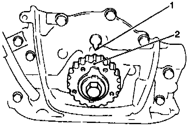 18. Ensure the alignment of the timing marks on the oil pump casting (2) and the crankshaft timing belt gear (1).
