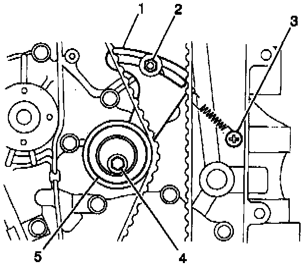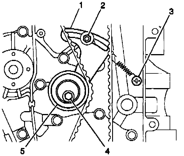 20. Remove the timing belt tensioner spring from the timing belt tensioner plate (1).
