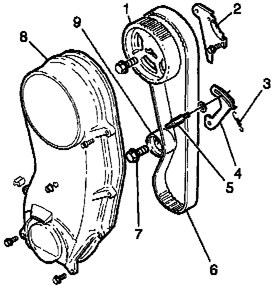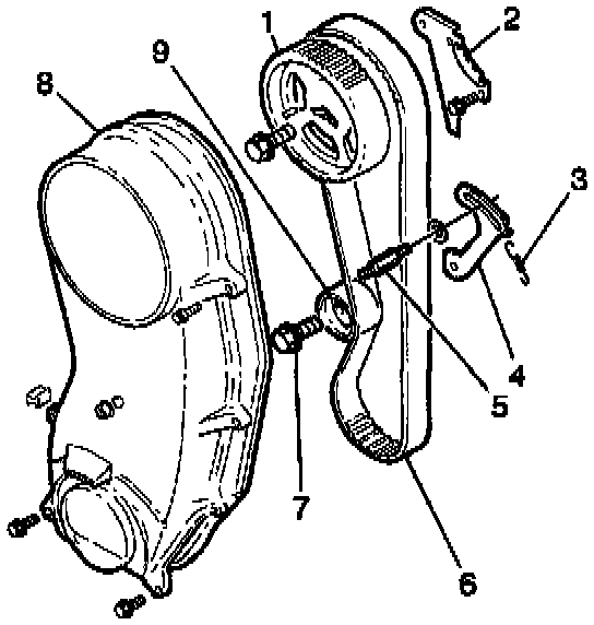 1. Inspect the timing belt (6) for wear or cracking. Replace the belt if necessary.