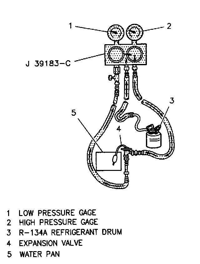 1. Connect the expansion valve to a J 39183-C; connect the gages set's charging hose to a Refrigerant-134a refrigerant drum.